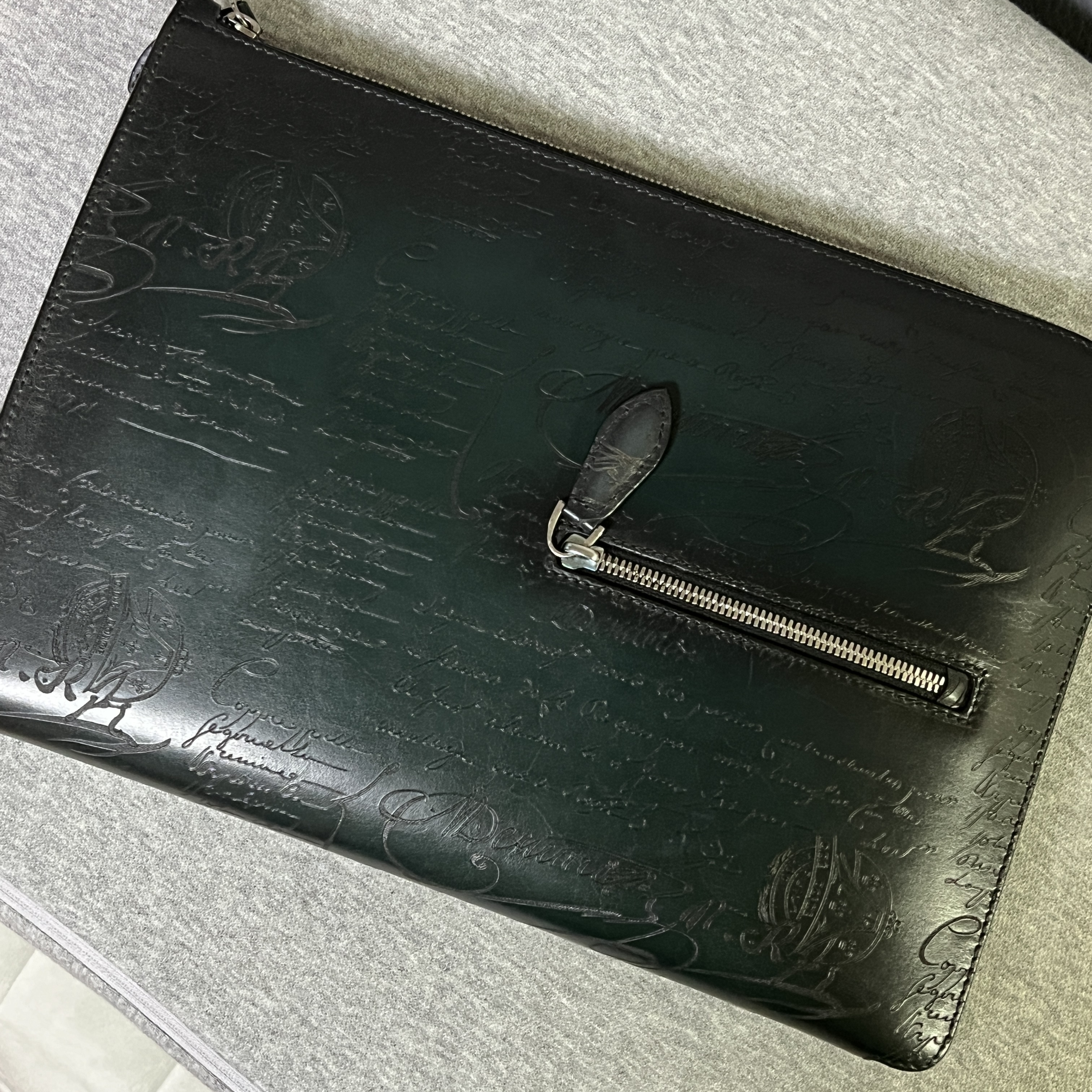 This clutch is filled with Berluti's signature Louis XIV's handwritten signature and engraving.